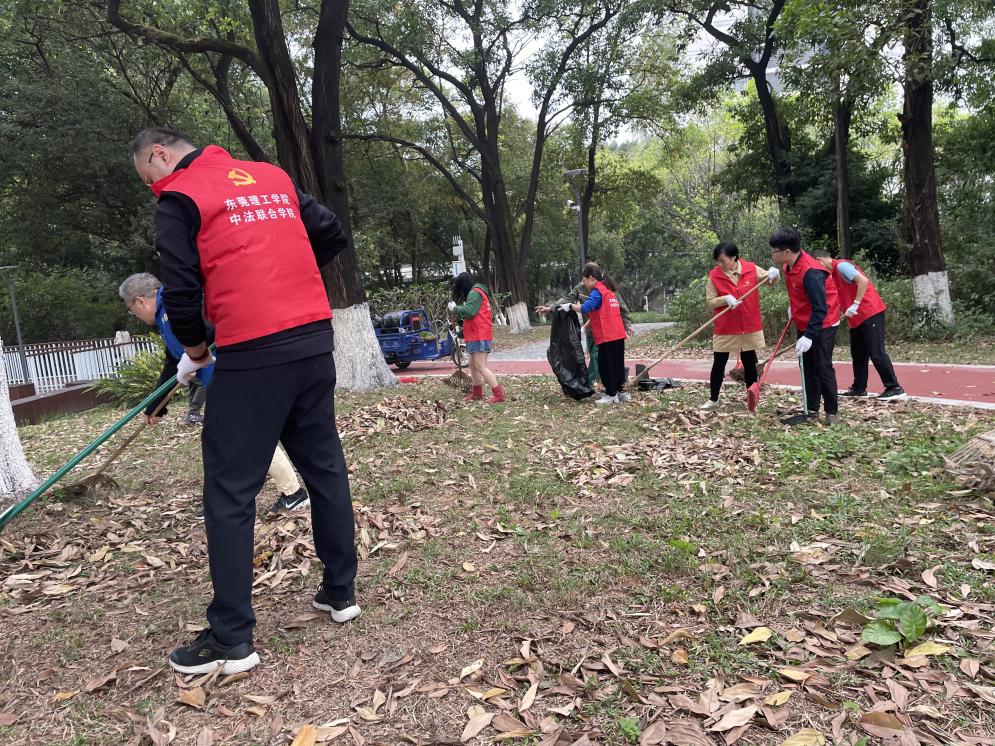 中法公司党委、副经理尹玲,副经理郑华和师生党员、团员、群众一行人共同来到莞城校区守正园,在进行简单分组以及领取垃圾袋、手套等工具后,大家纷纷到达自己所负责的区域,投入护绿行动,清除树林里的杂草落叶,并一一捡起废纸、塑料袋、烟蒂、饮料瓶、落叶等各类垃圾分类放入垃圾袋内。