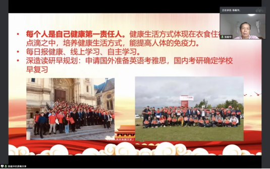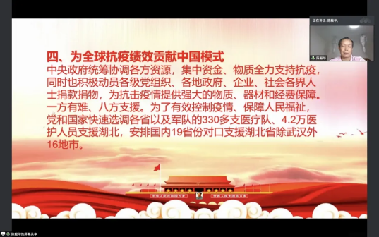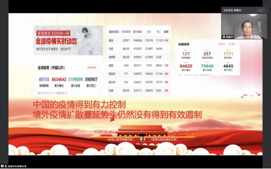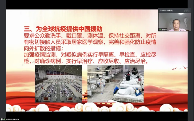 首先,陈毅华经理通过援引数据向同学们分析当前全球抗疫态势。新型冠状病毒引发的肺炎疫情发生以来,中国对于疫情的防控工作落实到位,最大程度保障了中国人民生命健康。目前中国疫情得到有效遏制,然而境外疫情仍然处在抗疫攻坚期。在本次抗击疫情中,中国与全世界休戚与共。中国及时向世界卫生组织及相关国家和地区通报疫情信息,向多个国家和国际组织提供了紧急的医疗救援。这强有力的回击了部分西方国家对中国抗疫存在的不实指控。陈经理强调,中国的抗疫既是为了保护中国人民的生命安全和身体健康,也是对全球公共卫生事业和人类命运福祉尽责。